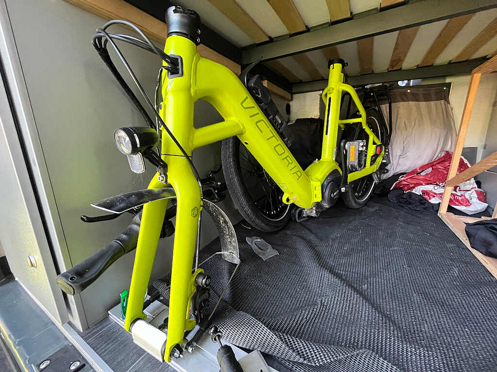 Nun können wir die Klappräder in der Heckgarage vom Kastenwagen / Wohnmobil transportieren und bei Zwischenstopps schlafen. Und zwar ohne die Fahrräder ausladen zu müssen.