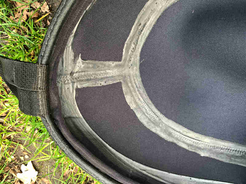 Am Außenrand der Neoprenspritzdecke ºhf Dry-Skirt sorgt eine dicke Latexbeschichtung für spitzen Halt auf dem Süllrand. Beim meinem Gfk-Kajak ist dies nicht unbedingt notwendig, da sich der starke Süllrandgummi extrem um den Süllrand legt und die Spritzdecke mehr als sicher spannt.